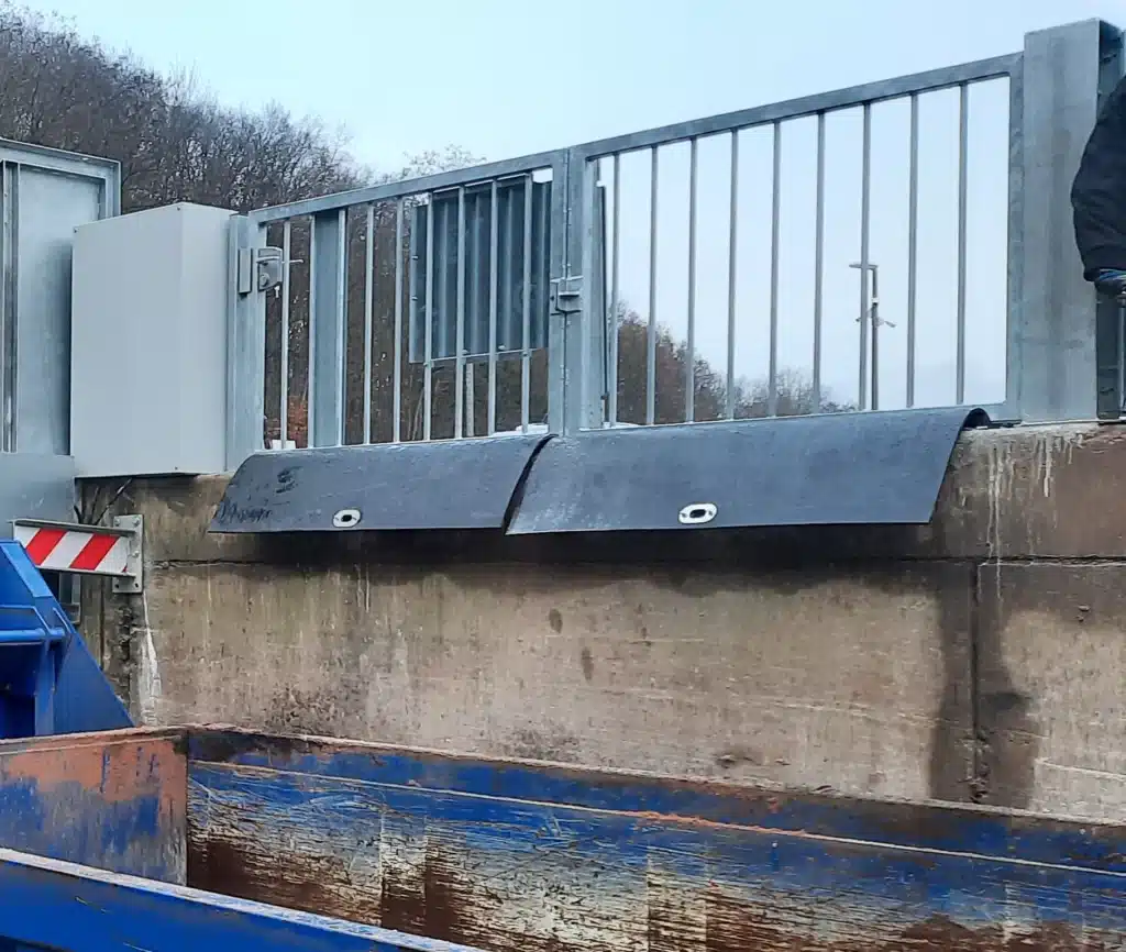 L’agent de la déchetterie, tout en étant protégé par le retour perpendiculaire, peut déverrouiller le mécanisme et ouvrir le garde-corps.