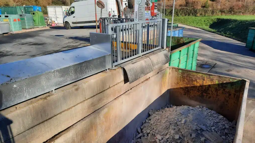 Ce système est principalement prévu pour le bennage des professionnels avec l’intervention d’un agent de la déchetterie, mais les particuliers peuvent jeter leurs déchets par dessus le garde-corps en toute sécurité.